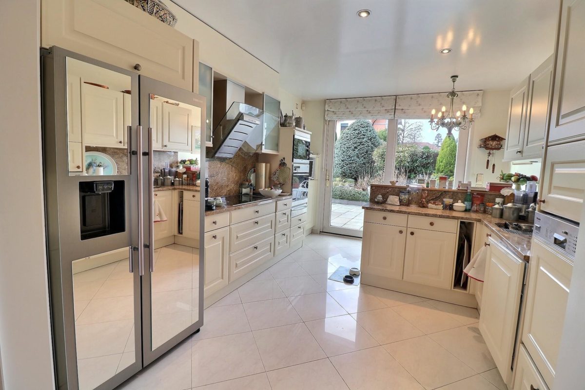 Dès l’entrée, un hall élégant avec WC visiteurs vous conduit vers un vaste séjour baigné de lumière, prolongé par un coin lecture chaleureux. La cuisine semi-ouverte, parfaitement équipée, s’intègre harmonieusement à cet espace convivial.