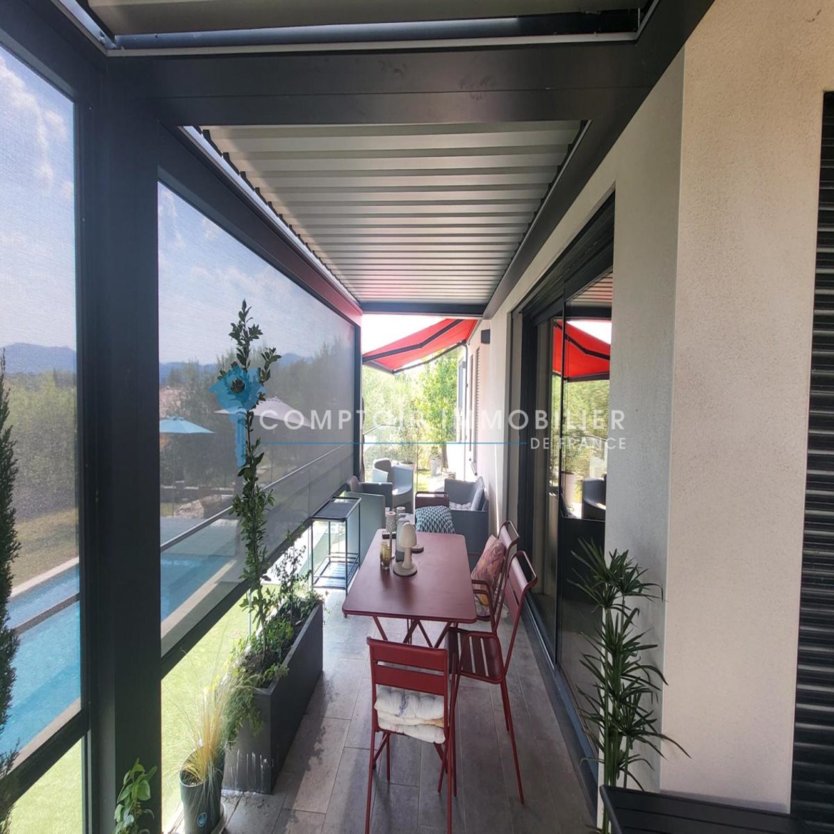 Afin de profiter de l'extérieur, vous trouverez plusieurs terrasses avec stores bannes et pergola bioclimatique donnant sur un jardin paysagé clos et une superbe piscine sans vis à vis.
